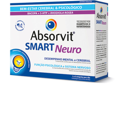 Absorvit® Smart Neuro é um suplemento alimentar com vários ingredientes ativos na sua composição, entre os quais plantas de uso tradicional tais como a Rhodiola rosea e a Bacopa monniera. Contém ainda 5-HTP, fosfolípidos, aminoácidos, minerais e vitaminas do complexo B.