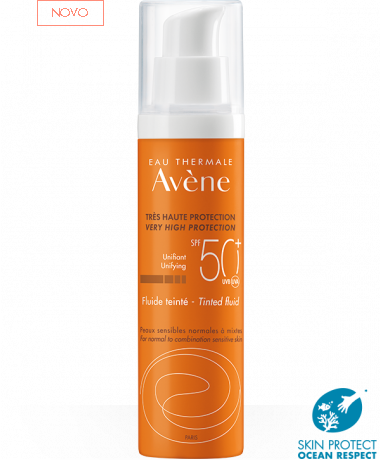 Fluido SPF 50+ com cor é adaptado à pele hipersensível ao sol. Pele sempre propensa a queimaduras solares. Pele sujeita a uma exposição solar intensa.