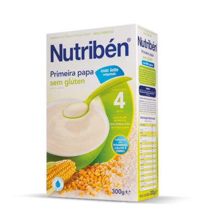 Nutribén primeira papa com leite adaptado é uma papa suave, composta unicamente por dois cereais  (milho e arroz) que são fáceis de digerir. Por ter leite adaptado incorporado, é fácil de preparar sendo só necessário adicionar água.