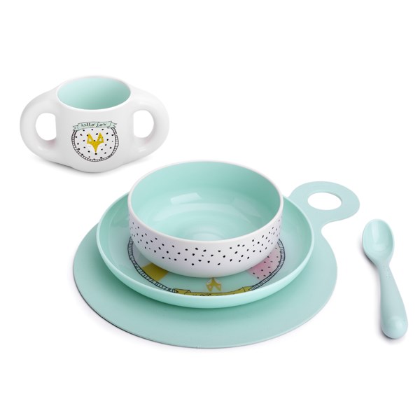 Emb.: Prato + tigela grande + copo com asas grandes para facilitar a sua aderência + colher ergonómica ideal para papas e boiões + base antiderrapante que impede que o prato se mova.
